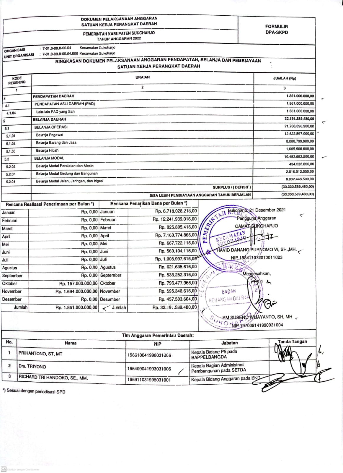 Dokumen Pelaksanaan Anggaran (DPA) Kecamatan Sukoharjo :
