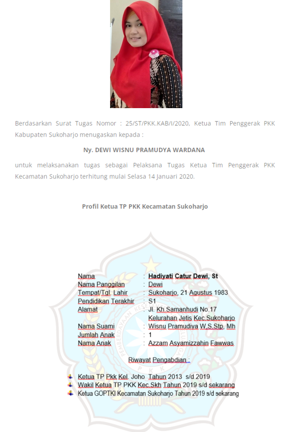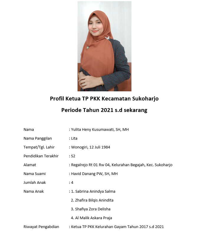 • Ketua TP PKK Kecamatan Sukoharjo Periode Tahun 2021 s.d sekarang